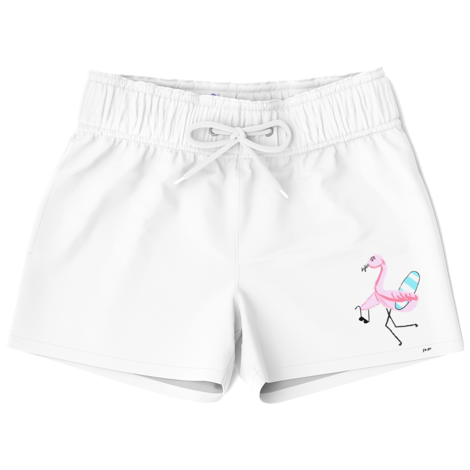 "Surf Flamingo" featured on white, shorter-length swim trunks. They come in a fast-dry fabric, and feature a drawstring waistband, mesh basket lining and mesh-lined side pockets.